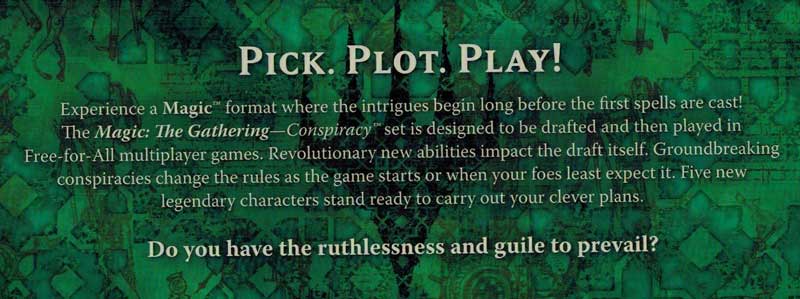 The first-ever multiplayer-focused booster set has new Magic cards with new mechanics that enhance multiplayer play. Returning favorites from throughout Magic's history round out the set and cultivate an environment of deception and treachery. The Magic: The GatheringConspiracy set is designed to be drafted with six to eight players who then split into groups of three or four players for free-for-all multiplayer games.